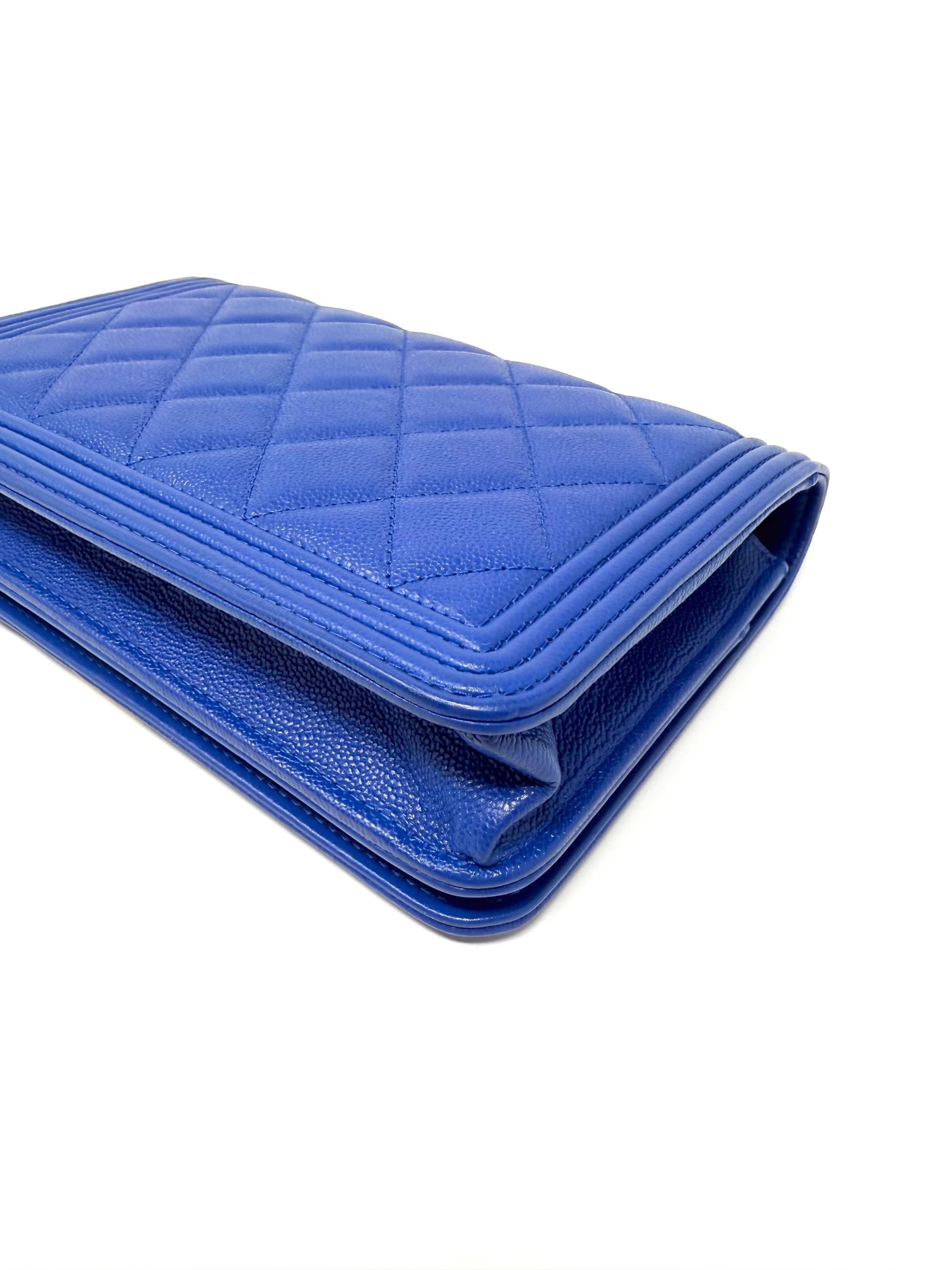 Description: This is a Chanel Boy Caviar Wallet On Chain Electric Royal Blue. It features luxurious diamond quilted caviar leather in a beautiful blue color with peripheral linear quilting. The bag features a chain-link shoulder strap and a Chanel Boy CC push lock detail. The facing flap opens to a compact interior of blue leather and fabric with card slots, a patch pocket, and a zipper compartment.
