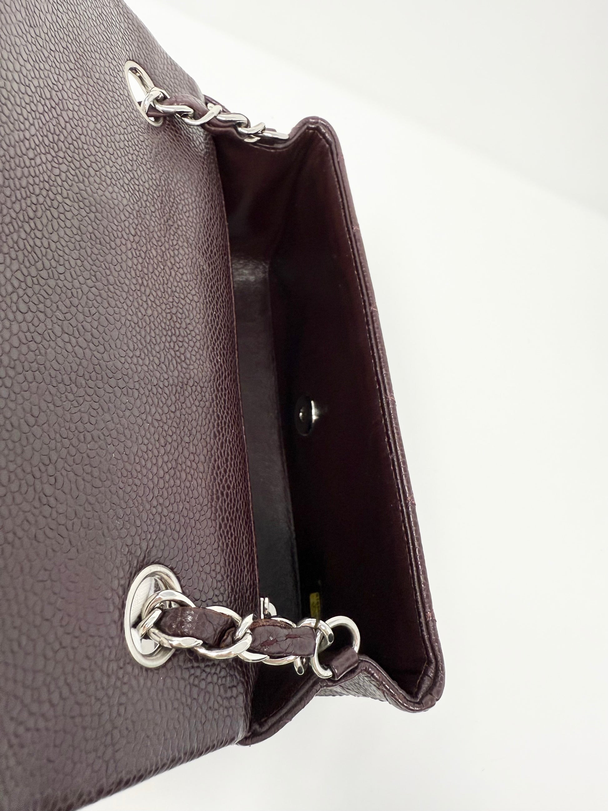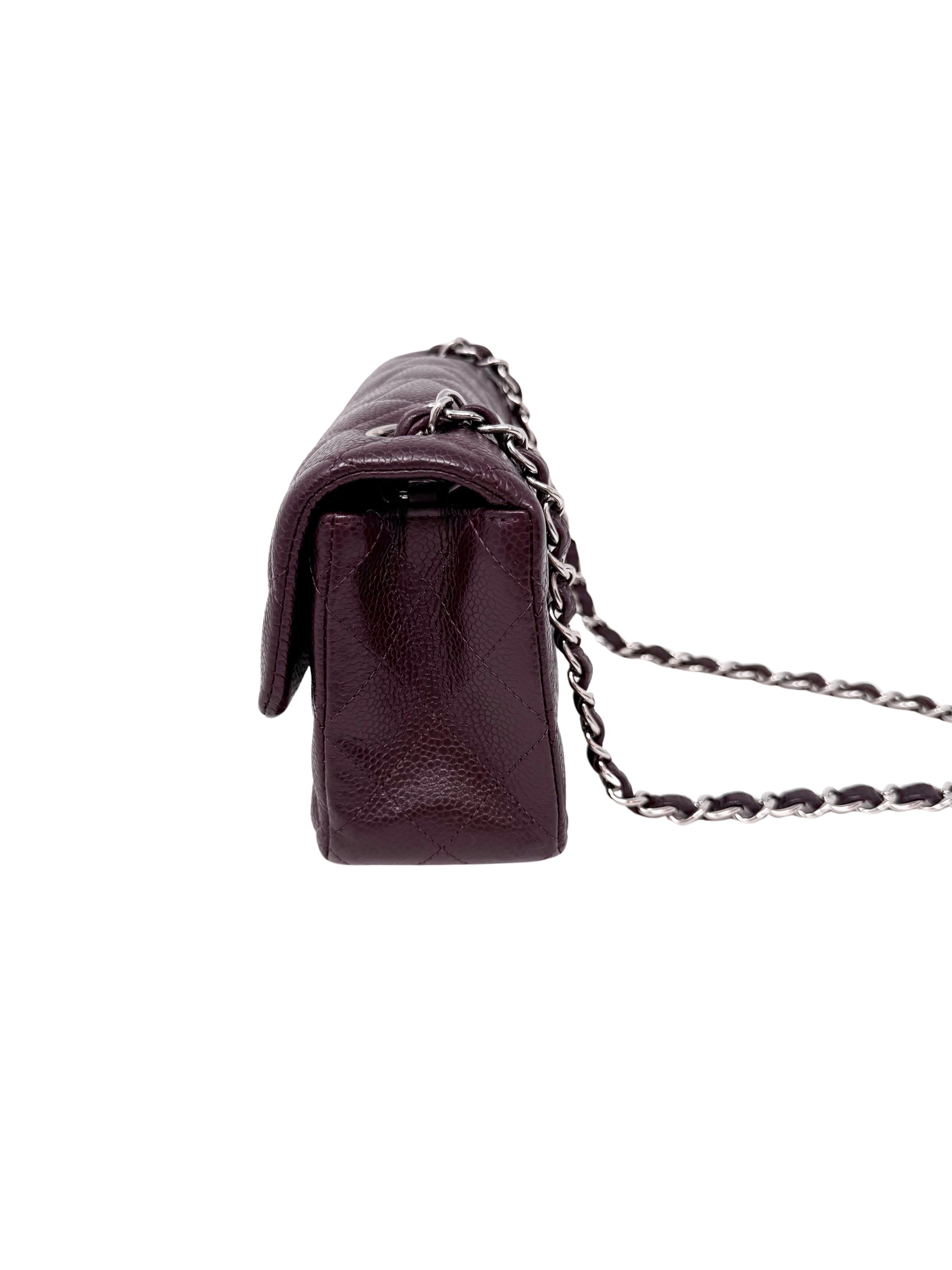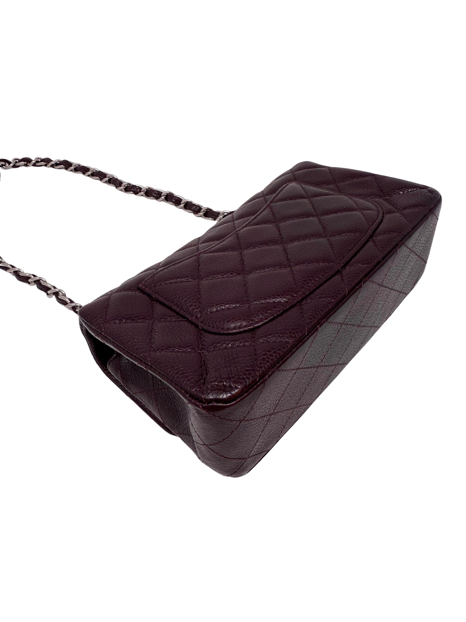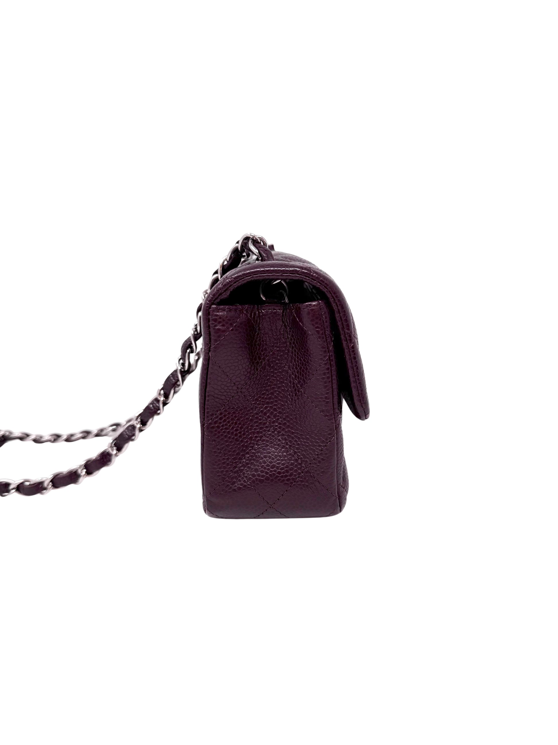 Description: This is a Chanel Caviar Classic Flap Mini Rectangular Burgundy Raisin. This classic flap bag is crafted of diamond quilted caviar leather in a beautiful deep burgundy color. It features silver hardware on the chain link shoulder straps as well as the CC turn lock logo. The sophisticated color, size, and durable leather make this a classic and timeless bag suitable for every occasion.