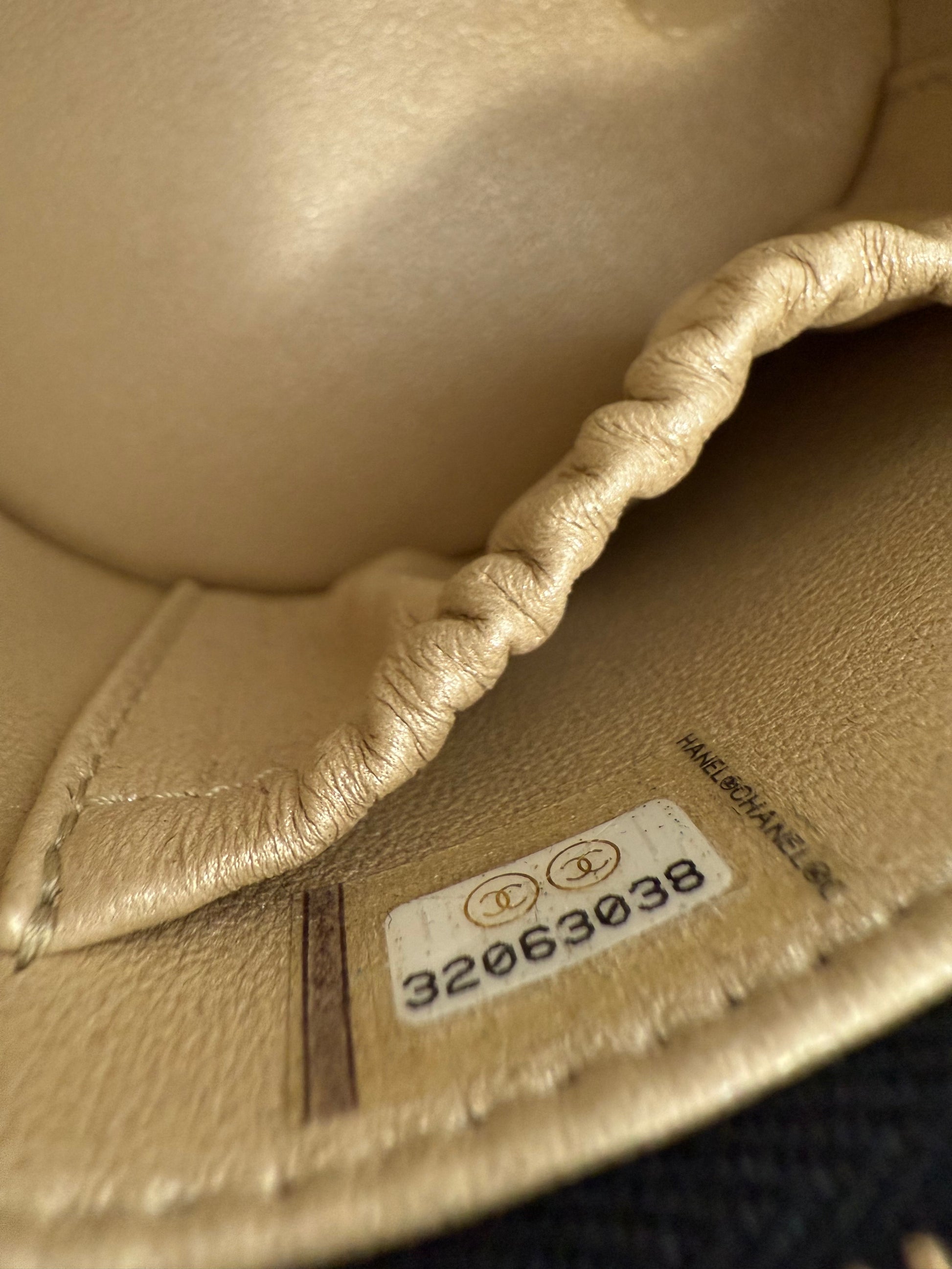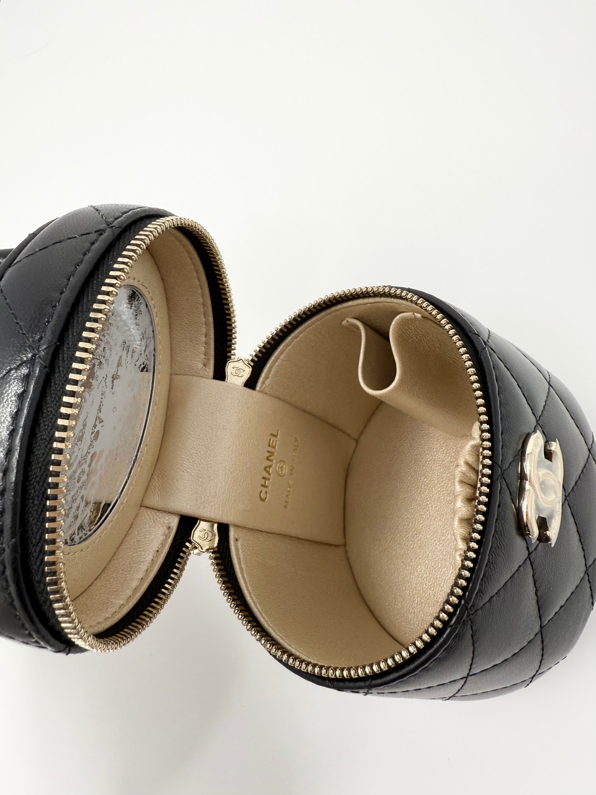 Description: This is CHANEL Quilted Lambskin Ruched Handle Mini Vanity Case in Black. This stylish vanity is crafted of luxurious lambskin leather. The bag features a ruched leather top handle, gold hardware, and a 3/4 wrap-around zipper that opens to a gold leather interior with a small patch pocket and a mirror. It makes the perfect elegant top handle bag for an evening out.