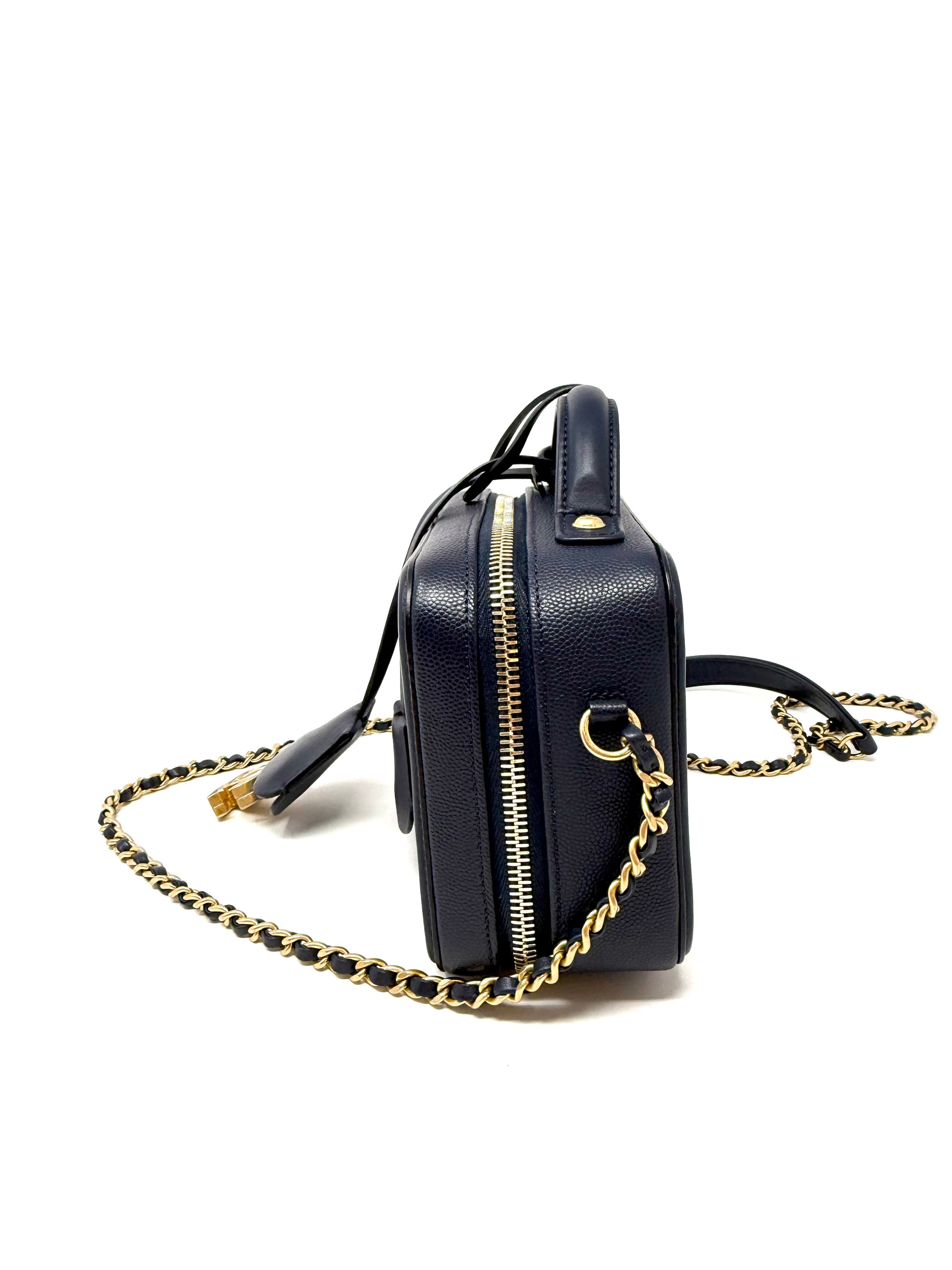 Description: This is a Chanel Small Caviar CC Filigree Vanity Case in Navy Blue. This chic stylish bag is crafted of luxurious diamond quilted caviar leather in dark navy blue. The elegant shoulder bag features a leather handle, matte gold chain link navy leather threaded shoulder straps and a large Channel CC stitched logo with gold tips on the front. The two top zippers open all around to a divided matching leather interior with a patch pocket.