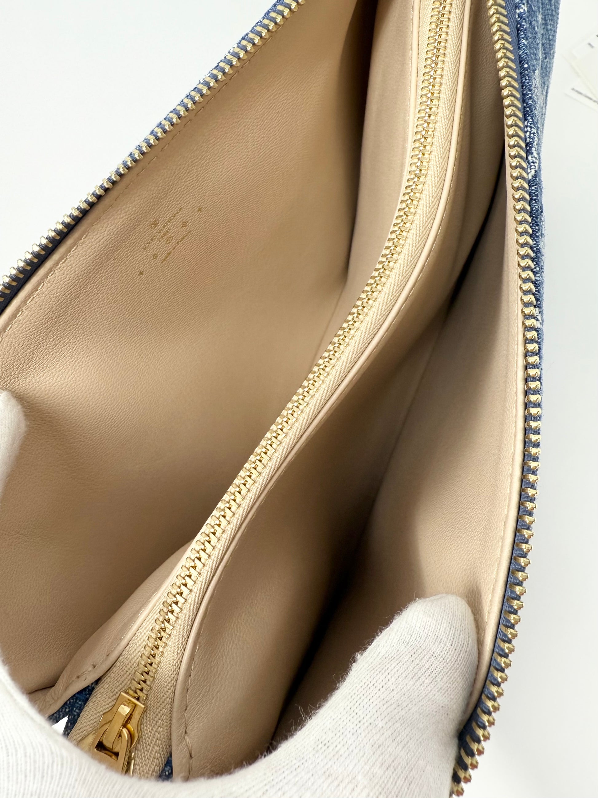 Description: This is a Limited Edition Louis Vuitton Coussin PM in Monogram Denim. It was released as part of the 2024 Limited Edition Louis Vuitton Remix Collection. The denim pieces in this collection were homage to the vintage Marc Jacobs denim collection that is still relevant today. It features denim LV monogram on stone-washed denim with vachetta and gold chain details in the popular Coussin style. It is truly a collector’s masterpiece.