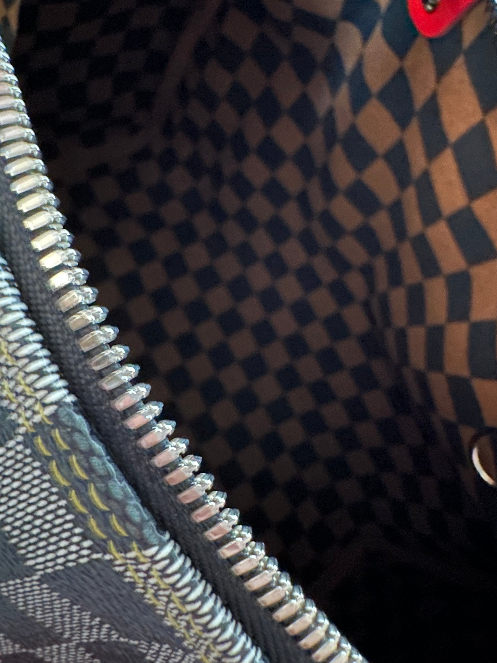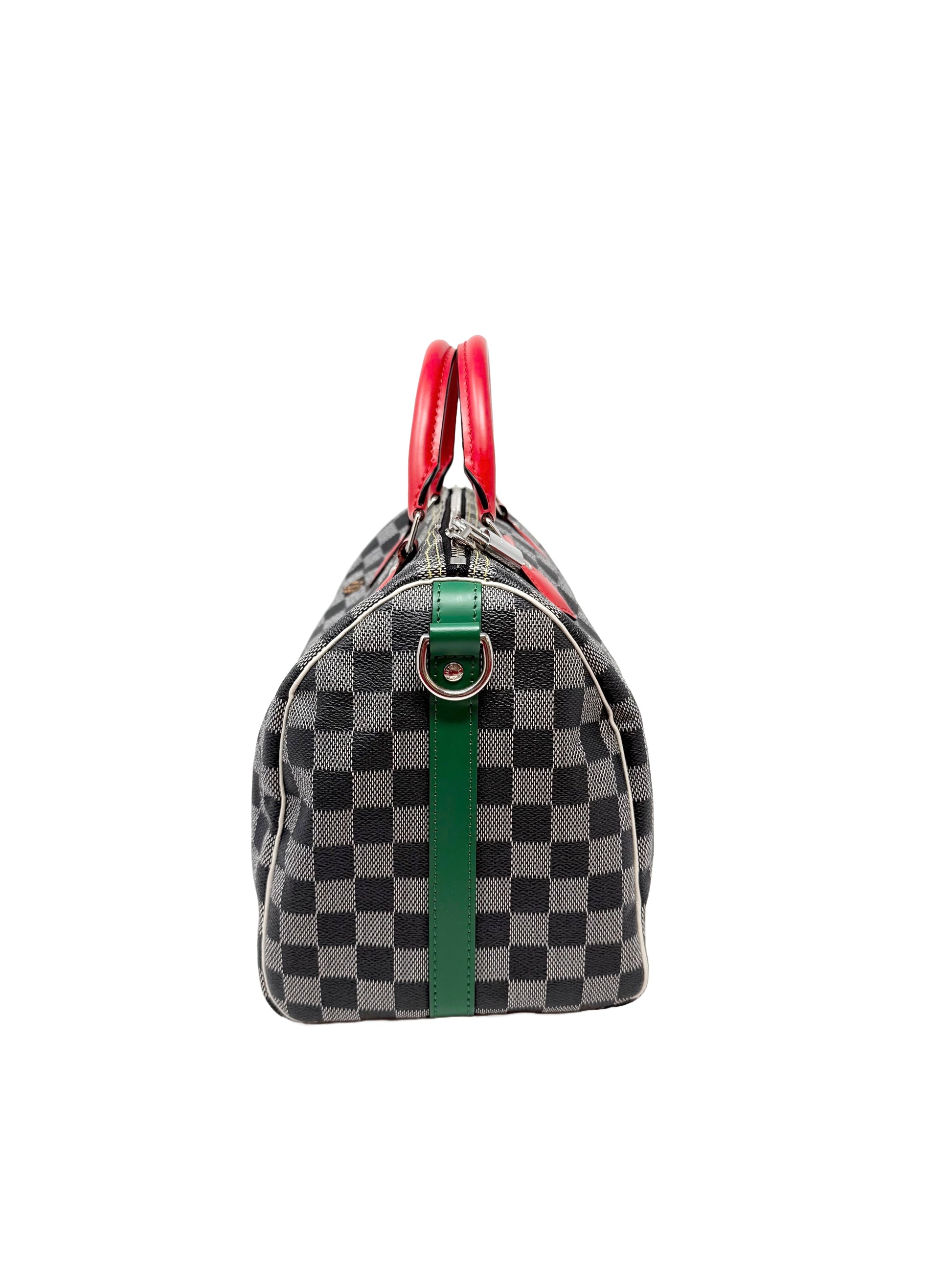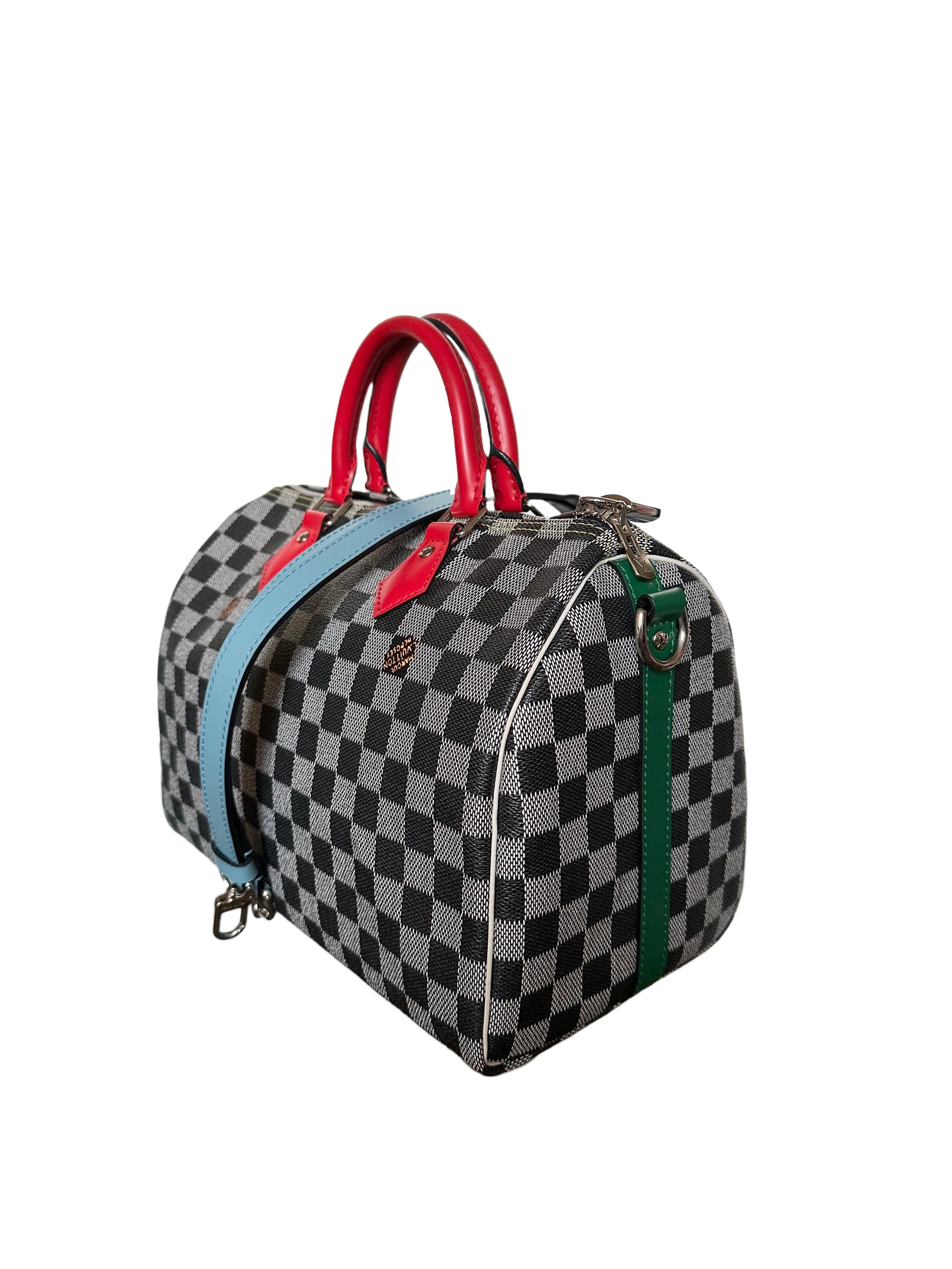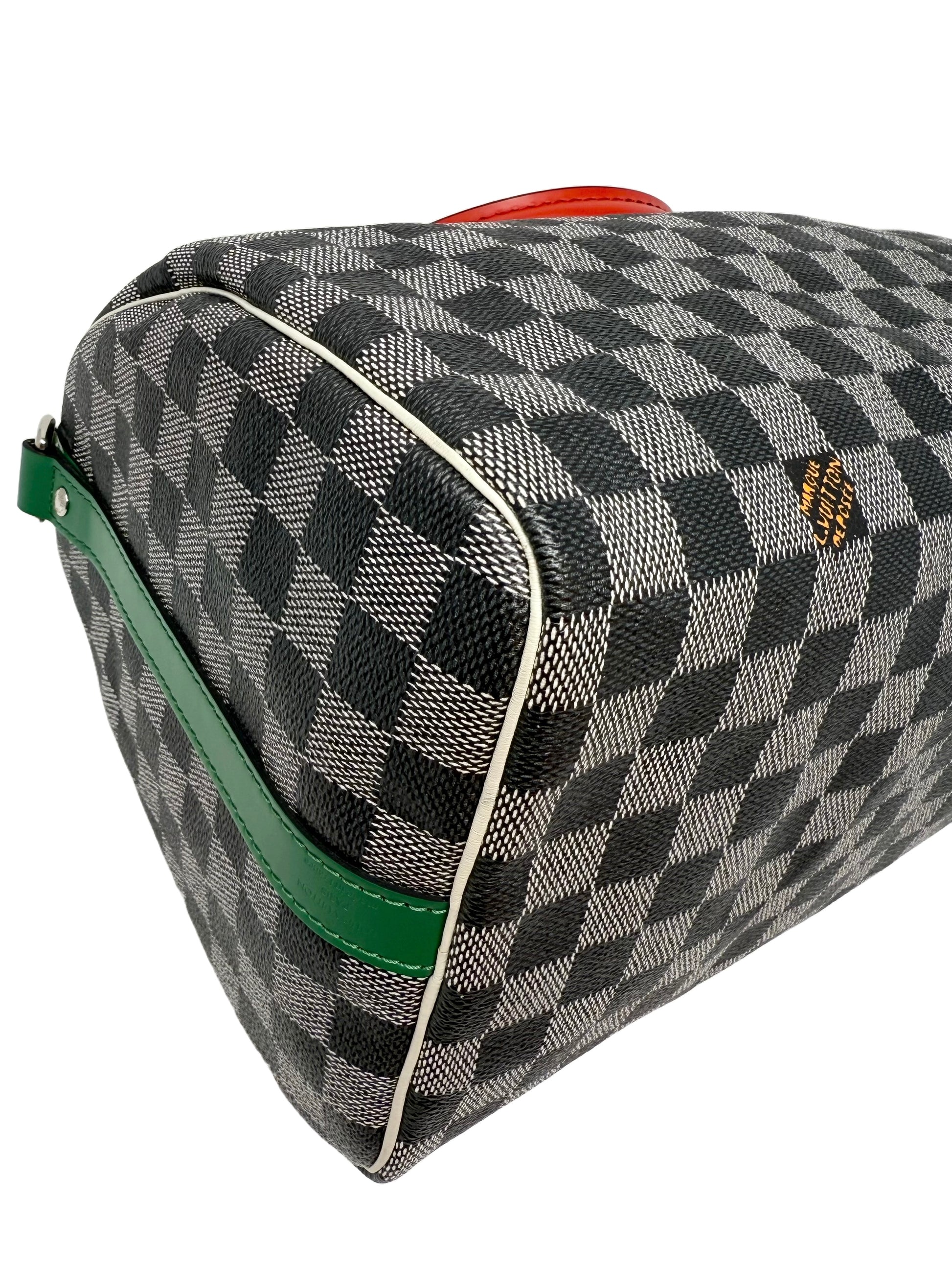 Description: This is a Louis Vuitton Damier Noir Speedy Bandouliere 30 in black and white damier coated canvas. It was designed by Nicolas Ghesquière for the FW19 Jungle collection for the French luxury house. It features a blue adjustable strap, red leather top handles, and green accents. This opens to a damier black and brown print microfiber interior with a patch pocket. It has polished silver hardware accents.