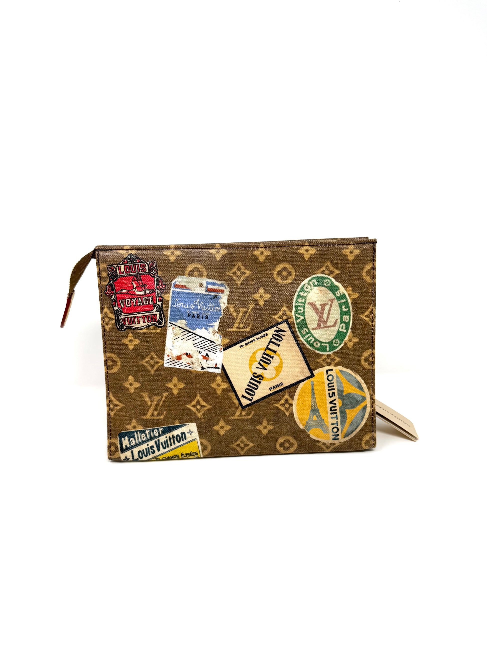 Description: This is a Limited Edition Louis Vuitton Monogram Flight Mode Toiletry 26 Pouch Bag. It features a spacious inner compartment and pockets perfect for organizing your belongings. The canvas has a vintage look and features a patchwork of Louis Vuitton travel stickers throughout.