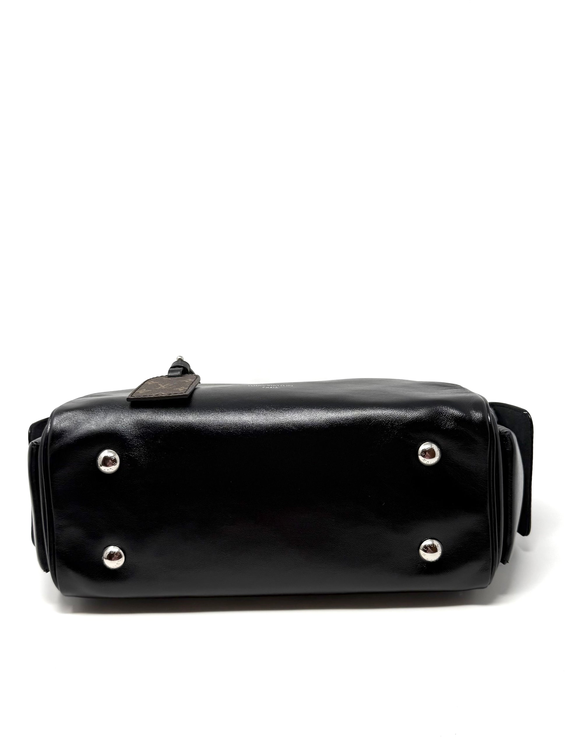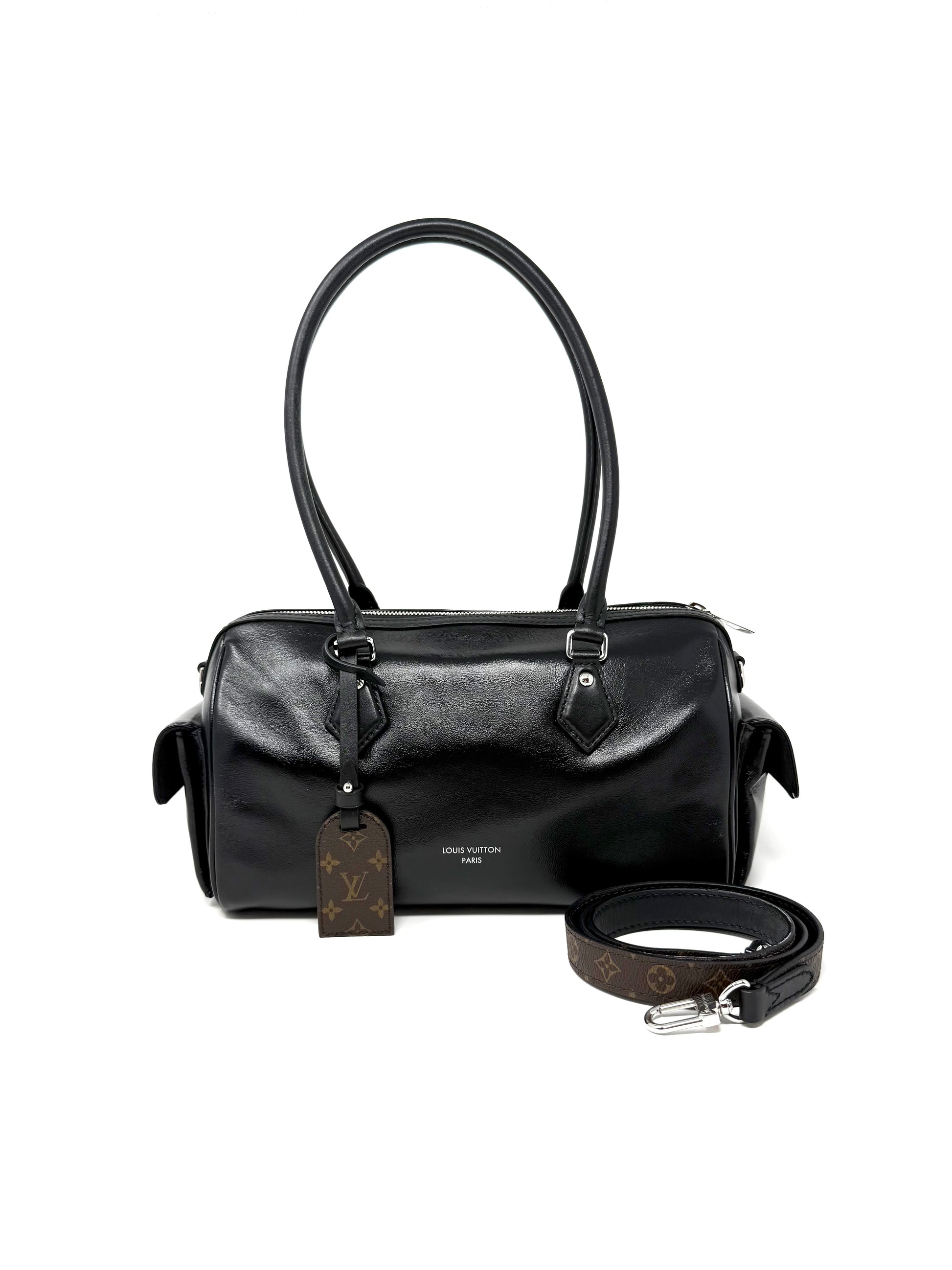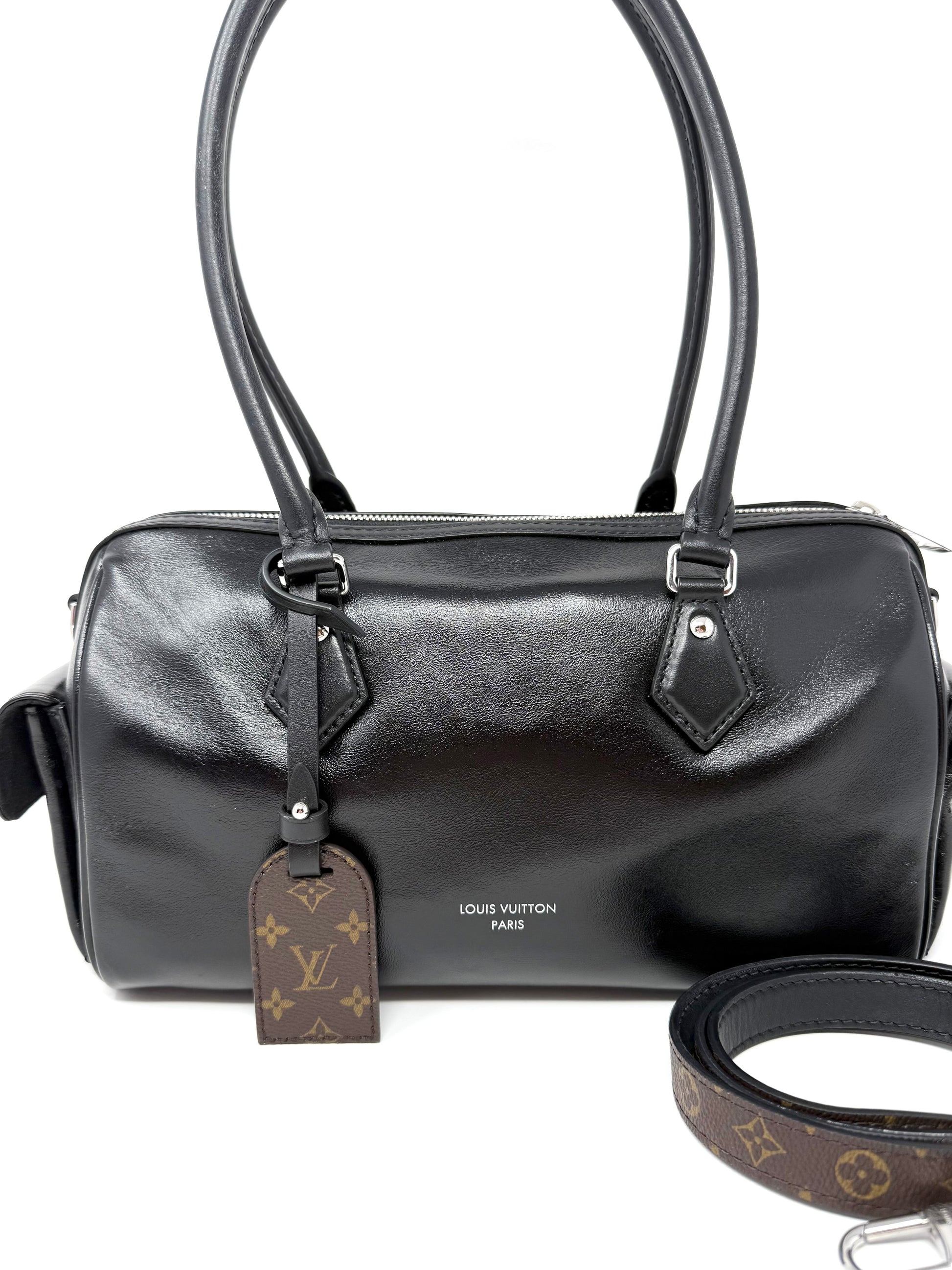 Description: This is a Louis Vuitton Speedy Cargo Vibe in Black. This chic handbag features luxurious glossy lambskin and LV monogram brown accents throughout. Not only is it spacious with plenty of pockets but it is also versatile as it can be worn over the shoulder, on crook of the arm or crossbody.