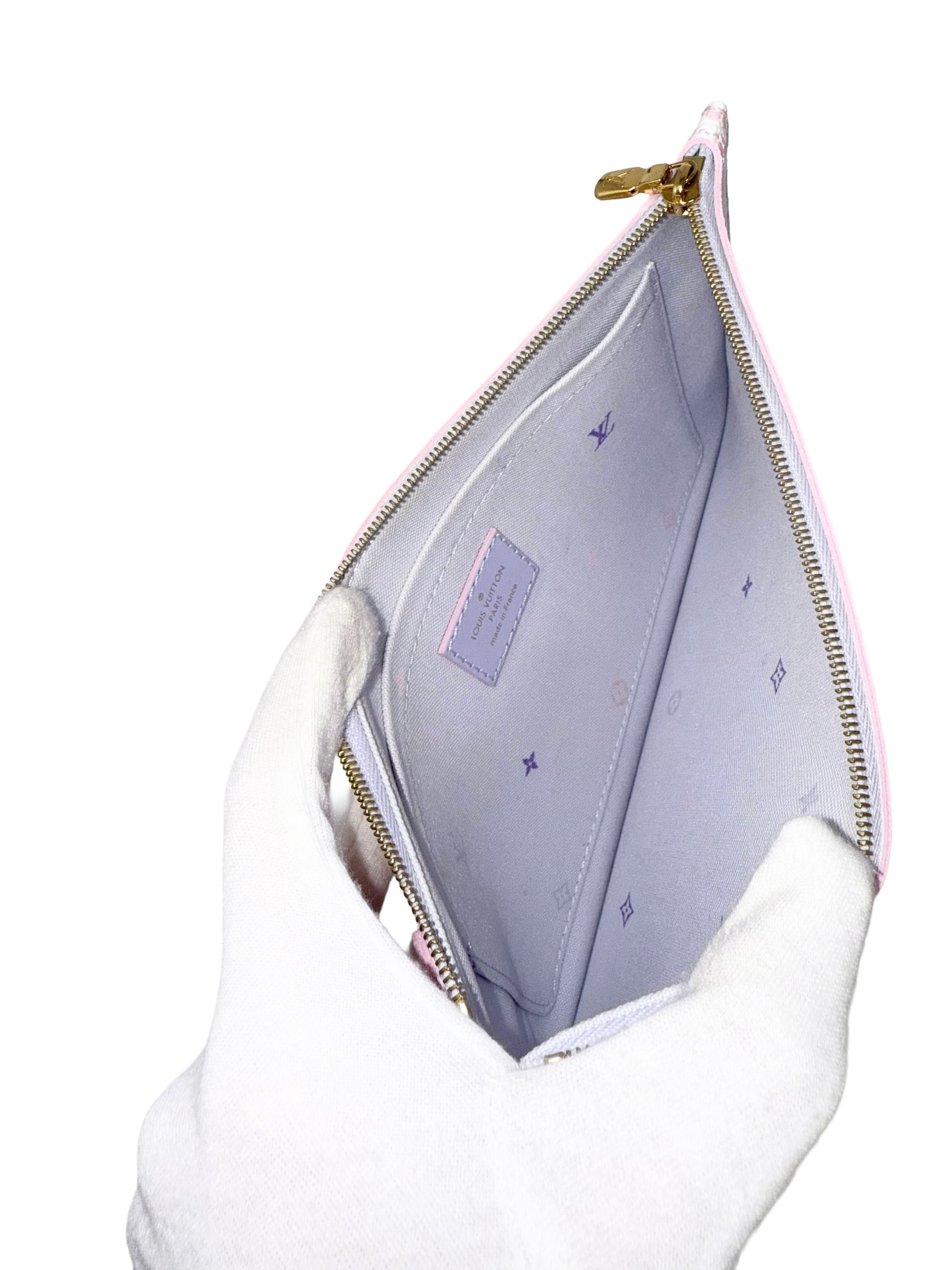 Description: This is a Louis Vuitton Monogram Giant Spring In The City Neverfull MM in Sunrise Pastel. This tote is part of the Louis Vuitton “Spring in the City” collection. This stylish tote is crafted of oversized classic Louis Vuitton monogram coated canvas in an ombre pink to blue contrast. The bag features two shoulder straps, trim and side cinch cords, with polished brass hardware. The wide top is open to a light purple fabric interior with a zipper pocket and a matching pochette. The top can be secured across with a snap strap inlay. The Louis Vuitton Neverfull can be carried by hand, in the crook of the arm, or over the shoulder.