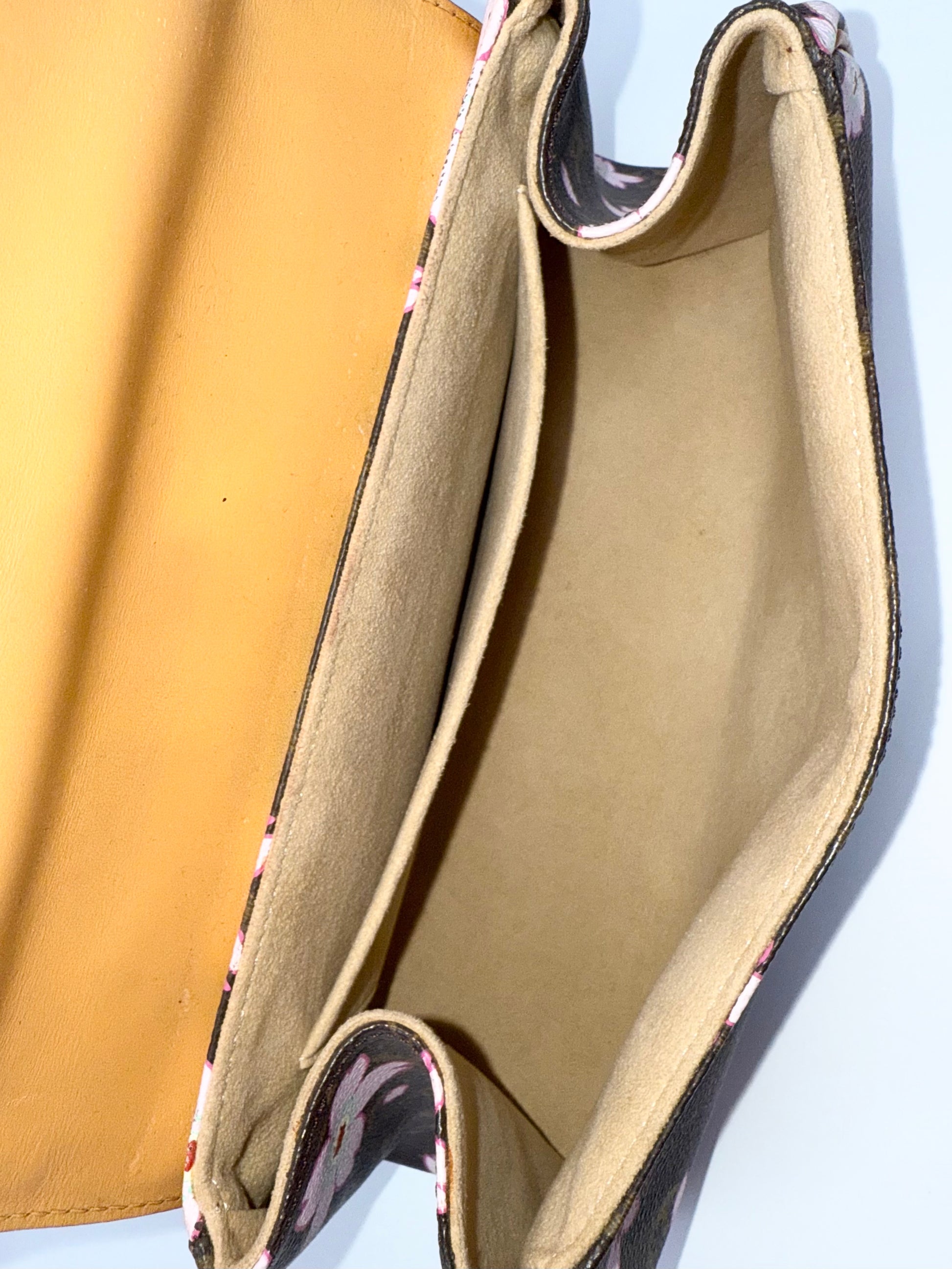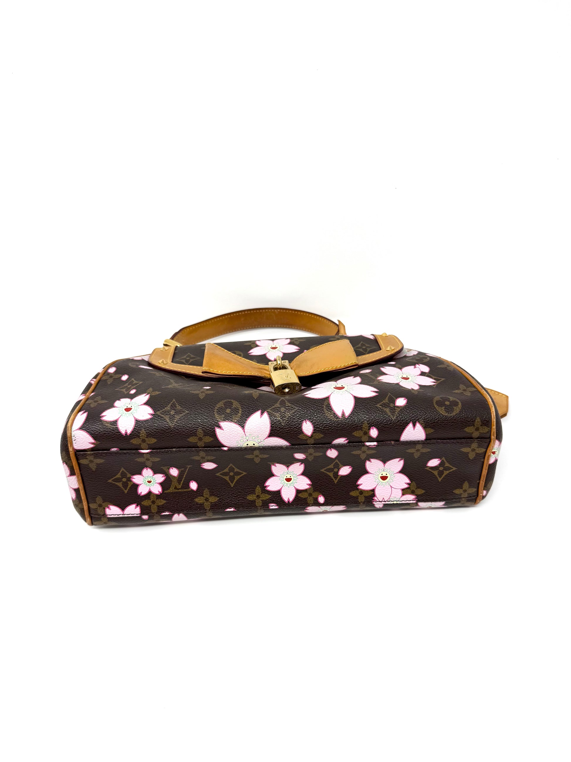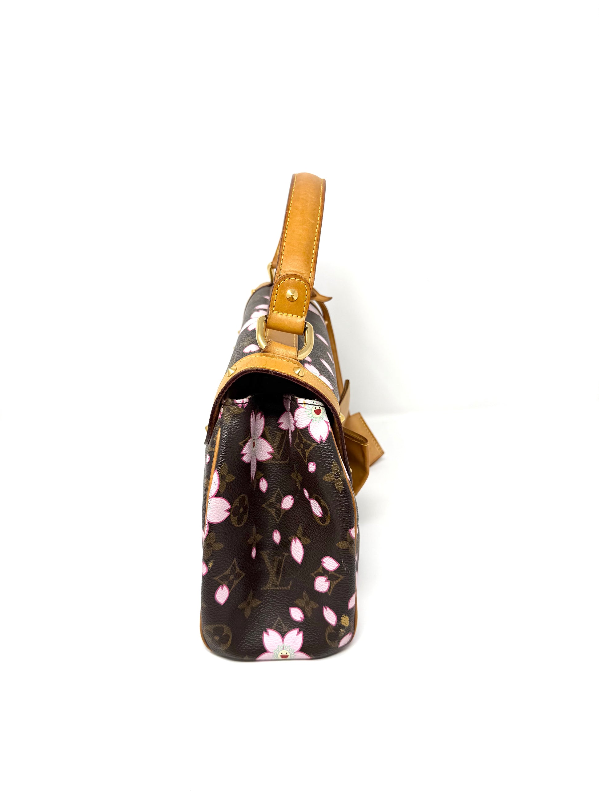 Description: This is a beautiful Louis Vuitton Sac Retro handbag from the exclusive 2003 Cherry Blossom line. It is made out of the traditional monogram toile with the pink Cherry Blossom print overlay and has natural vachetta leather trim. The leather trim has gold studs and there is a gorgeous leather bow with a lock in the middle in classic Murakami style.