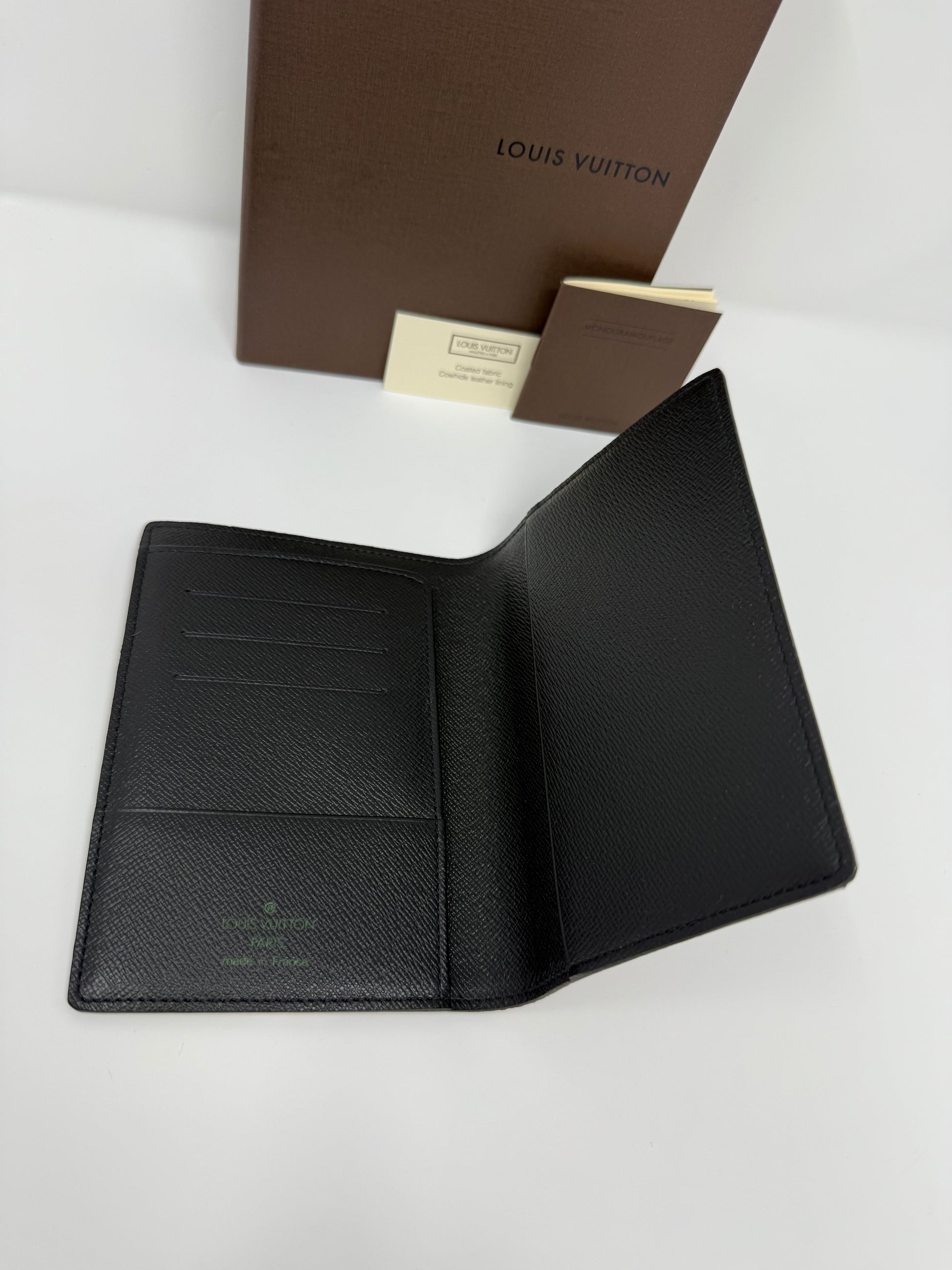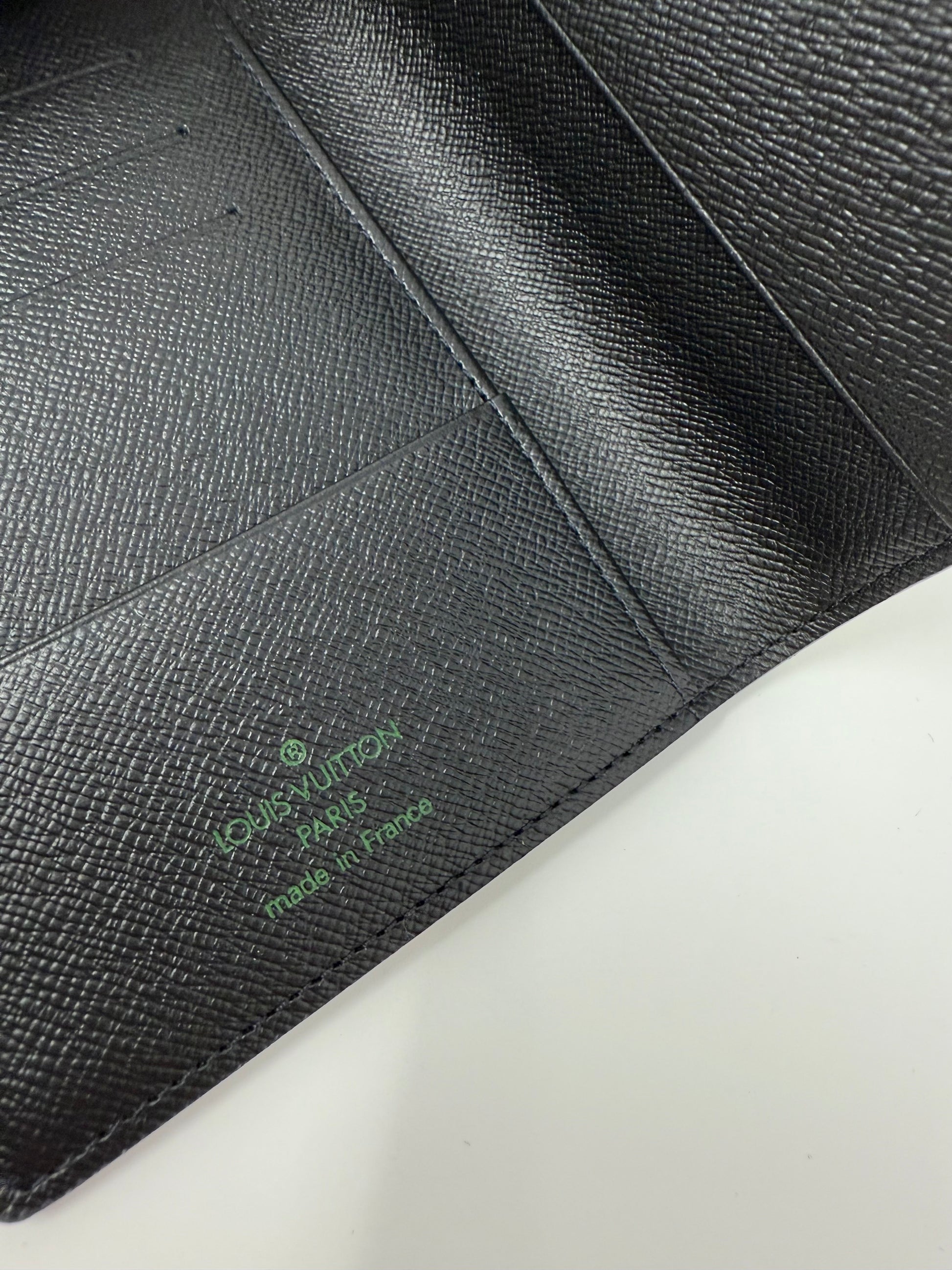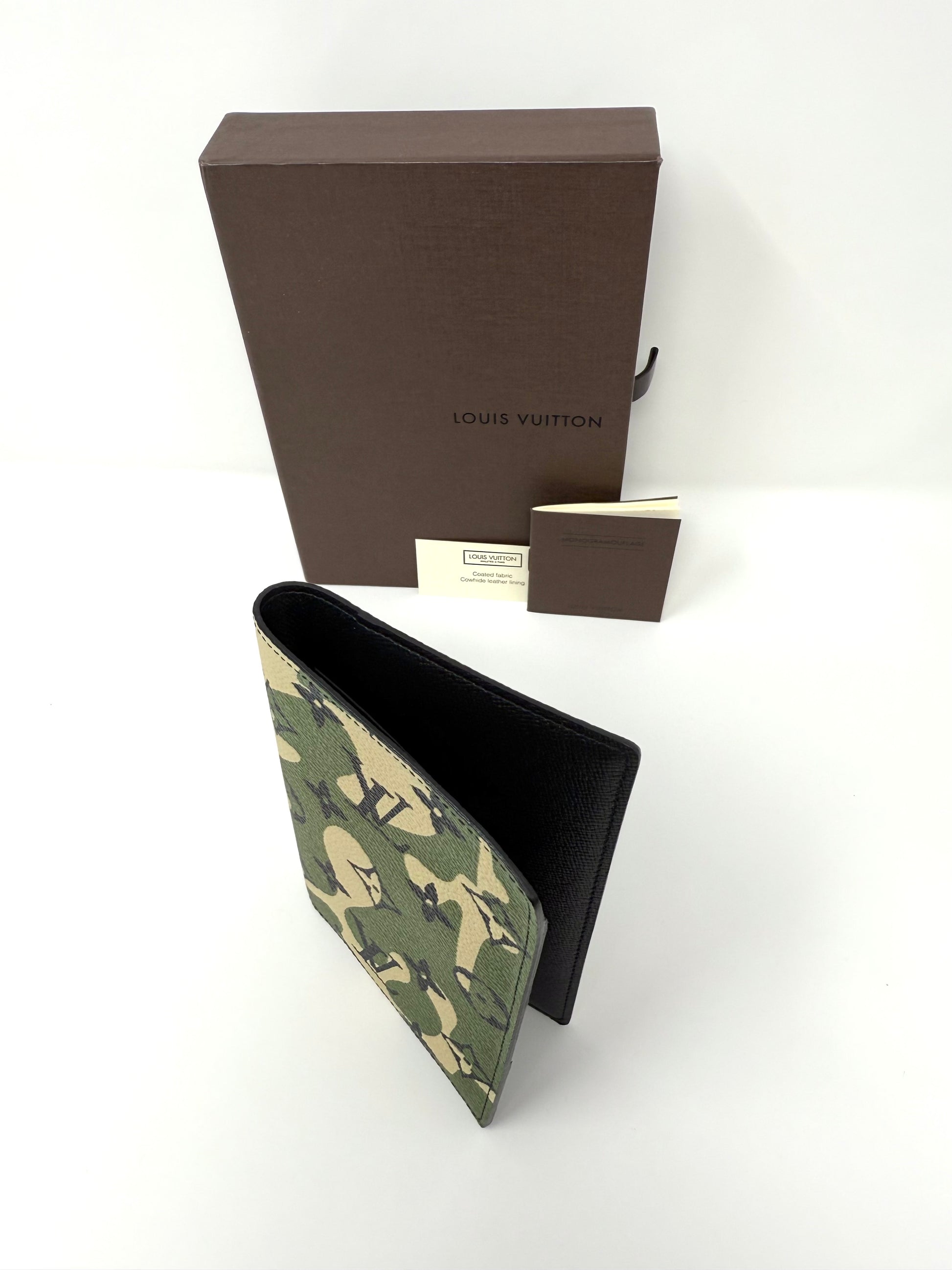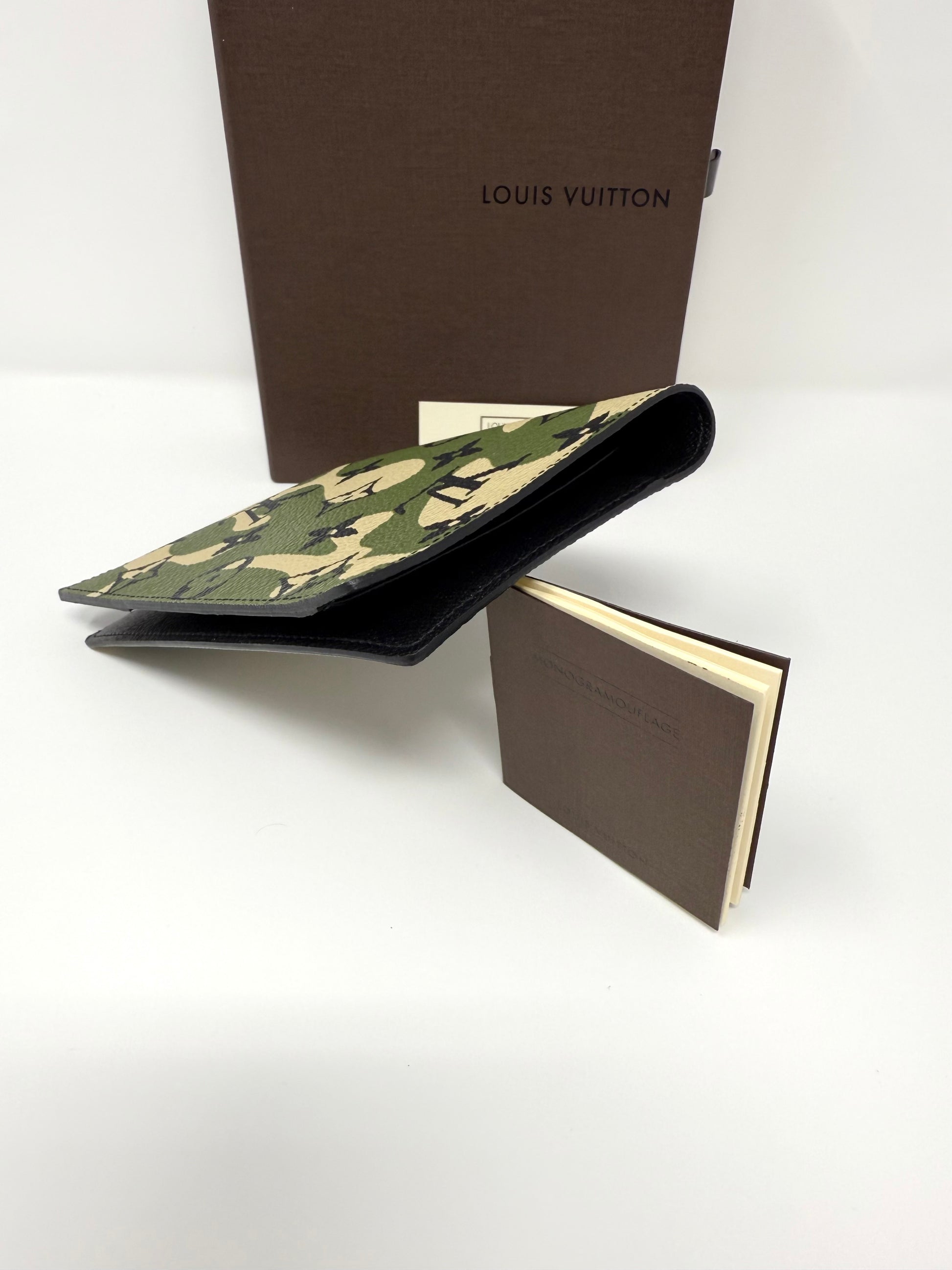Description: This is a Limited Edition Louis Vuitton Takashi Murakami Monogramouflage Passport Holder. It is a rare piece from the coveted 2008 Monogramouflage collection. The wallet opens in a folder style to a black cross-grain leather interior with card slots, a patch pocket, and space for a passport.