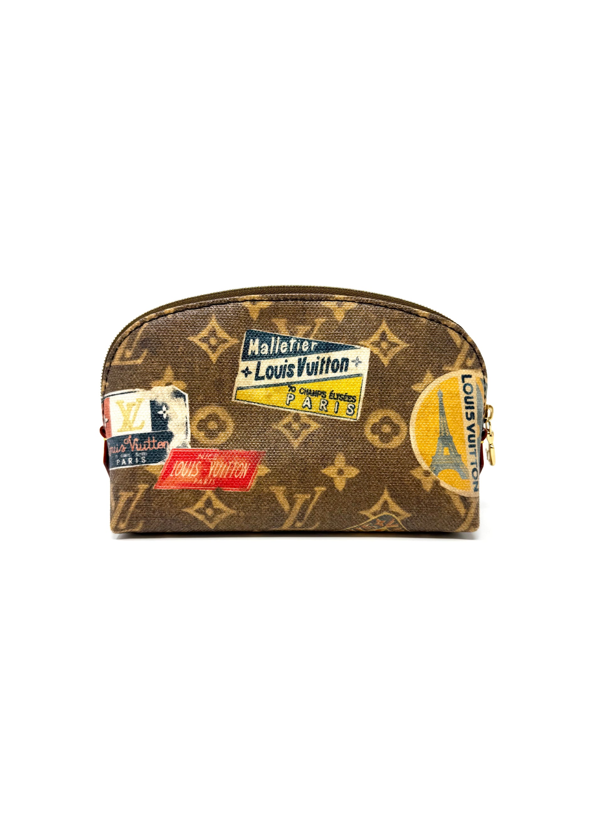 Description: This is a Limited Edition Louis Vuitton Voyage Flight Mode Hotel Stickers Cosmetic Pouch. This was released during the coveted Flight Mode collection. The canvas has a vintage look and features a patchwork of hotel stickers throughout.