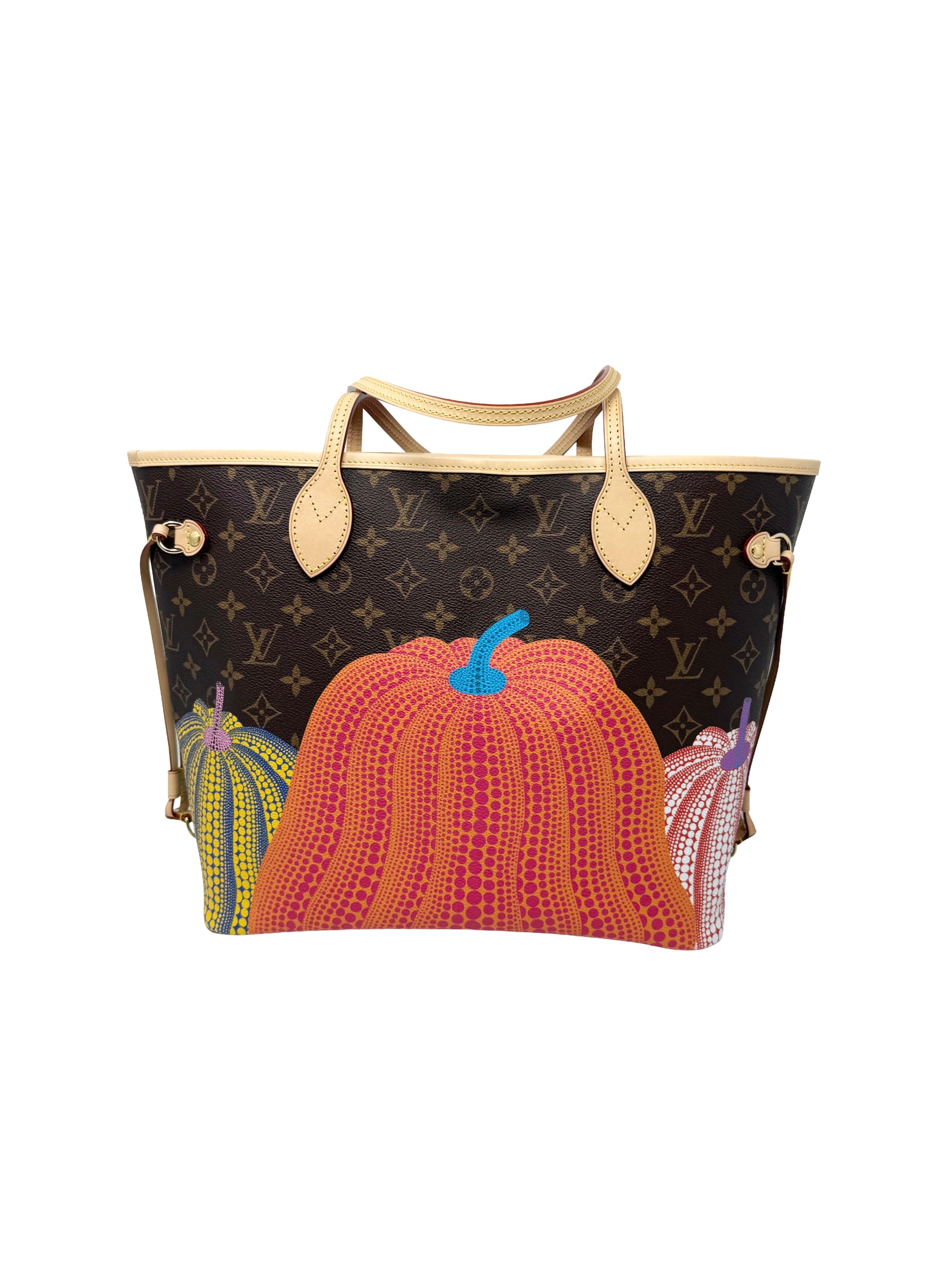 Description: This is a rare Limited Edition Louis Vuitton x Yayoi Kasuma Pumpkin Neverfull MM. For the “Pumpkins” theme of the new Louis Vuitton x Yayoi Kusama collection, this version of the LVxYK Neverfull MM tote comes with an exclusive eye-catching print on monogram canvas. The House’s signature material is adorned with psychedelic stylized pumpkins, echoing a recurring theme in the renowned Japanese artist’s work. A compact, easy-to-carry bag becomes an artistic expression.