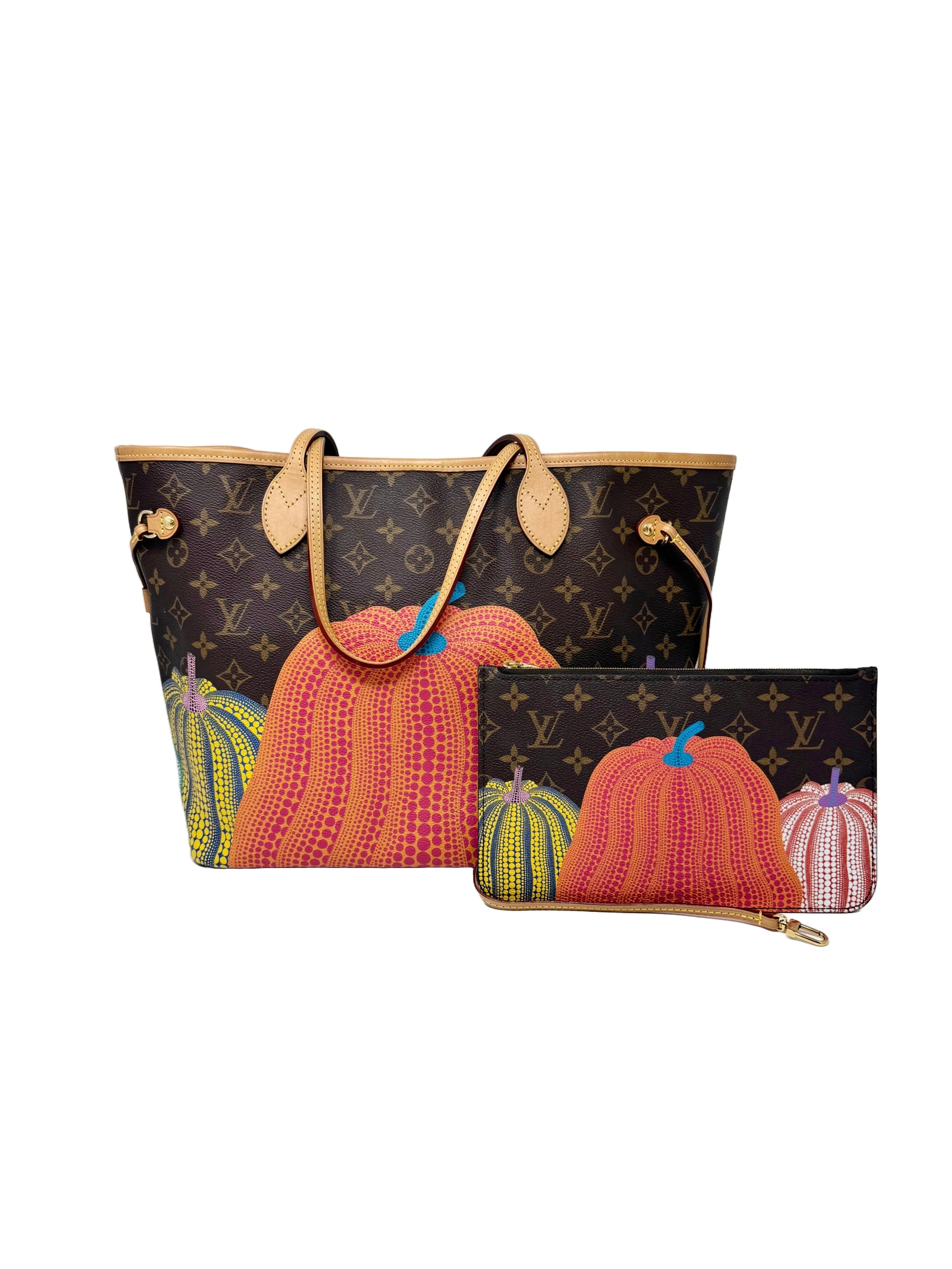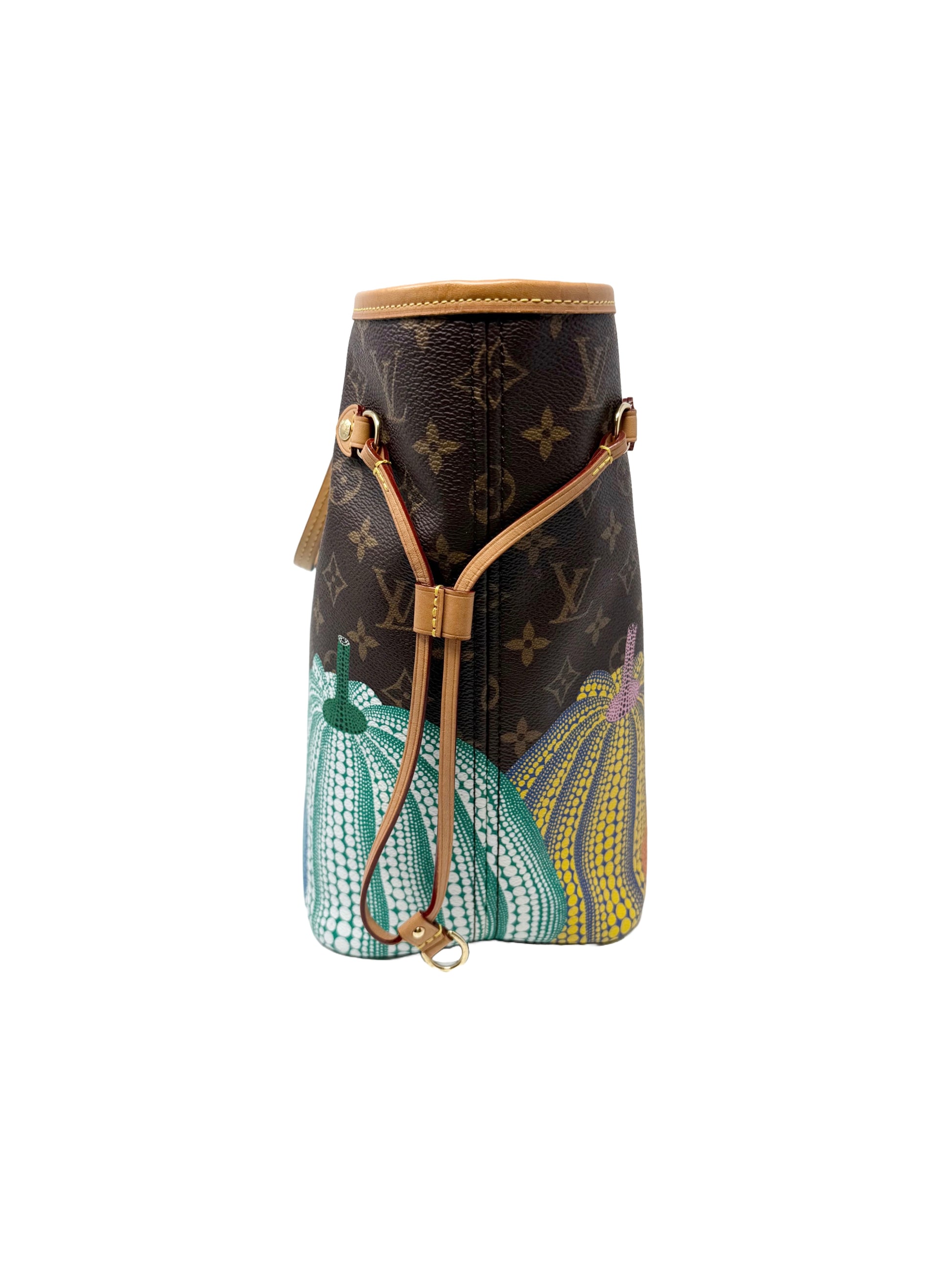 Description: This is a rare Limited Edition Louis Vuitton x Yayoi Kasuma Pumpkin Neverfull MM. For the “Pumpkins” theme of the new Louis Vuitton x Yayoi Kusama collection, this version of the LVxYK Neverfull MM tote comes with an exclusive eye-catching print on monogram canvas. The House’s signature material is adorned with psychedelic stylized pumpkins, echoing a recurring theme in the renowned Japanese artist’s work. A compact, easy-to-carry bag becomes an artistic expression.